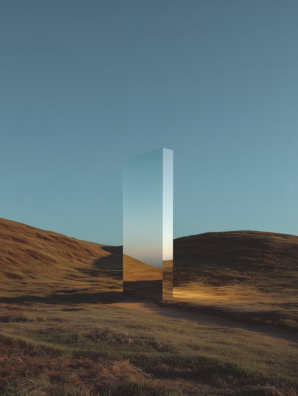 Prompt: A surreal landscape featuring a tall, thin monolithic mirror standing upright in the middle of gently rolling grassy hills during golden hour. The mirror is highly reflective and seamlessly blends with the environment, reflecting the sky and the horizon, creating an illusion of transparency. The lighting is warm and soft, casting long shadows across the terrain. The grass is dry and textured, with a clear dirt path leading toward the monolith. The sky is clear with a gradient from soft blue to light orange near the horizon. The atmosphere is calm, cinematic, and contemplative. Shot in ultra-high resolution with a realistic, slightly stylized rendering similar to a high-end 3D render or fine art photograph.